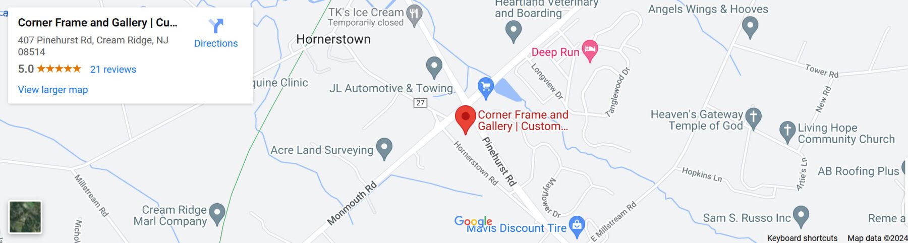 Located at the corner of 537 and 539 in Cream Ridge NJ, Corner Frame and Gallery is your most experienced custom picture framing professional serving Monmouth, Burlington, and Ocean counties.